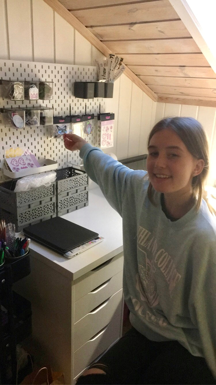 Jeg startet nettbutikken i 2021, da var jeg 18 år og endelig gammel nok til å opprette enkeltpersonforetak. Her viste jeg stolt frem noen klistremerker jeg hadde laget.